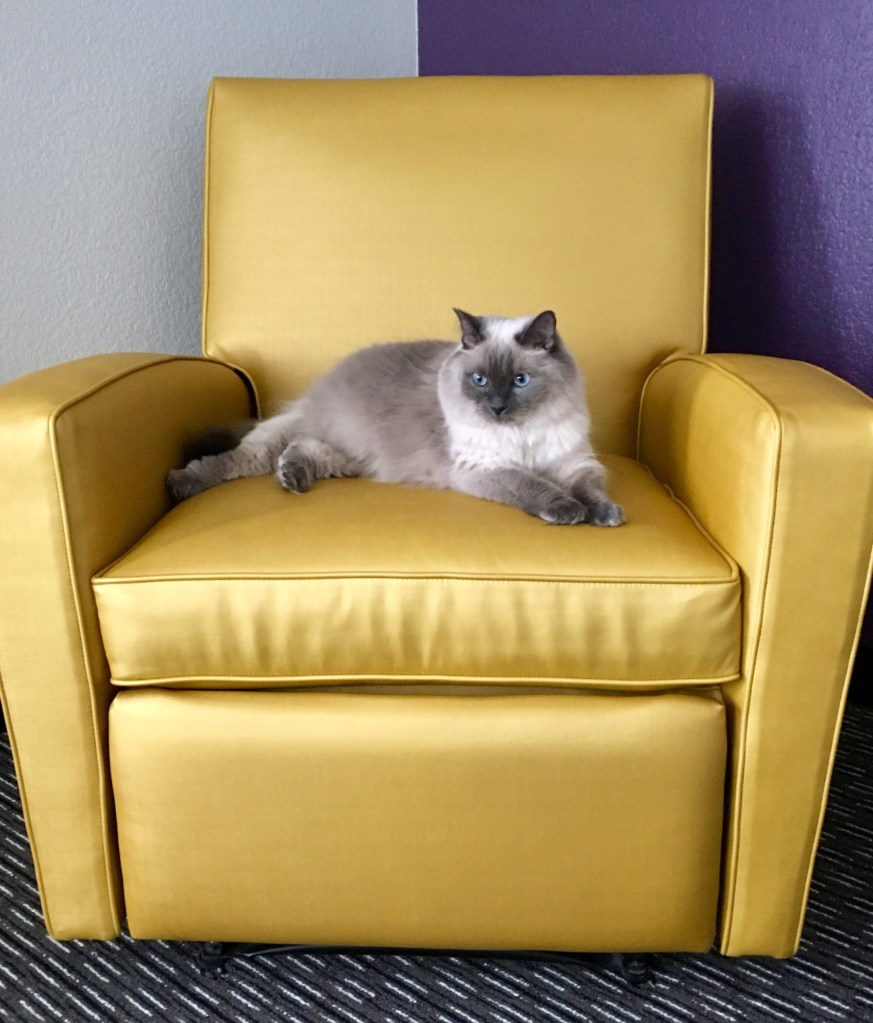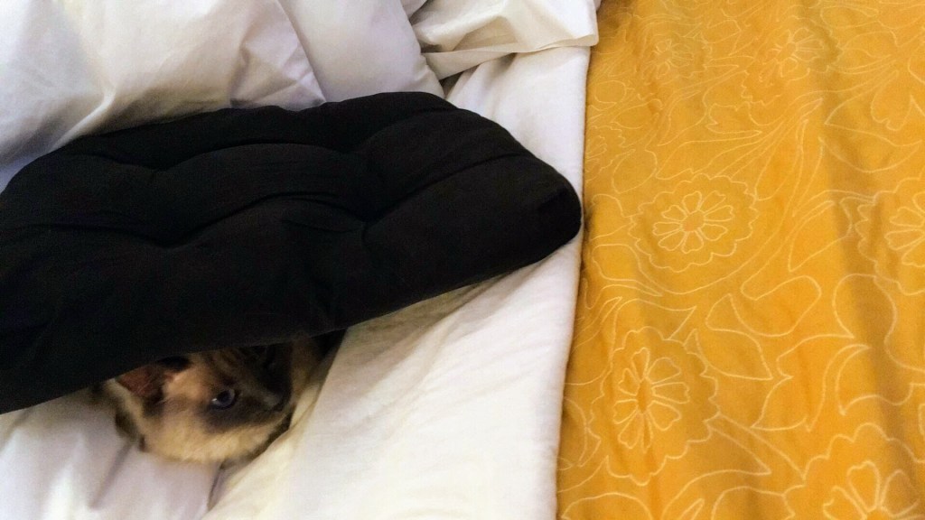 The one stop where we forgot to call ahead to on this trip was a La Quinta in northern Florida. La Quintas are usually a safe bet for being “cat friendly.” Weary from a seven hour drive in stormy weather, I stared in dismay at the hand printed sign on the check in counter… ”No Cats!”
