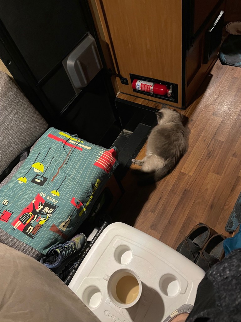 Ellie Mae’s first adventure in Eppy the Escape Pod (Our “new to us” 2018 Thor Majestic 19G RV…) was a major learning curve, for all of us. It began when she was captured during her afternoon nap and stuffed into her much hated cat carrier. After submitting to this initial indignity, she resolved to make the most of whatever came next. She secretly hoped it would not be another vet visit.