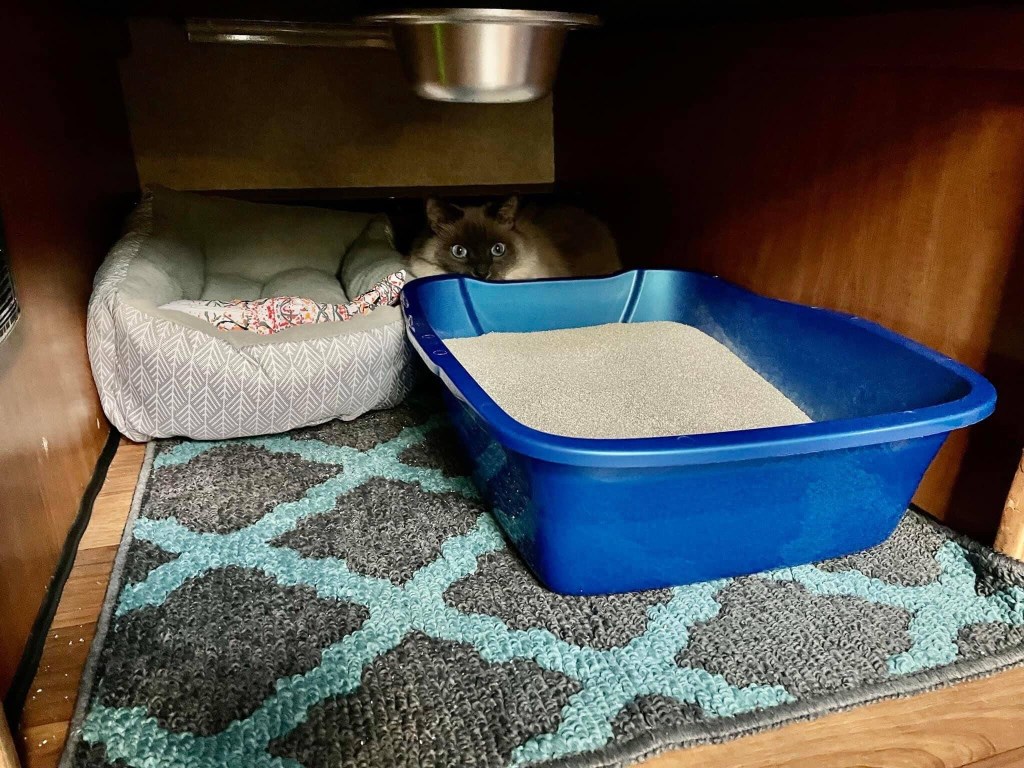Once we were safely parked in our camping space at Lake Kissimmee State Park, and all of our outside chores (hook-ups for power and water) were done, we released Ellie Mae from her carrier. She began to explore her new “home away from home.” Satisfied there were no dogs, she retreated to her hiding place under John’s bed. We expected this, so all of her things were already stashed under there. Stationing herself in the farthest corner, she was surrounded by her new Yeow catnip fish… (BTW, I recommend this Yeow brand of catnip toys to all my fellow cat servants…) her new cat bed (actually a dog bed, but don’t tell her…) and her new litter box. She busied herself rubbing her scent on all of these new things. She would spend much of her time over the next couple of days rubbing her face against her new belongings, claiming them as her own.