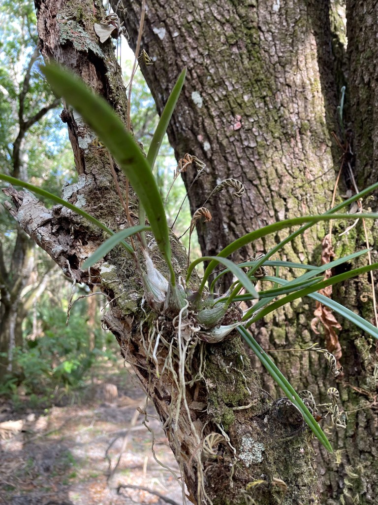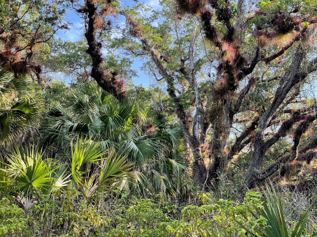We had originally toyed with the idea of staying on the White Trail, which goes on to a housing development in Grant-Valkaria. It is mostly exposed and very sunny, however… and we knew the day would soon heat up, so we changed our minds and went down into the “Old Florida Jungle” part of Red Trail instead. That seemingly prehistoric setting never fails to thrill us. It is an isolated world full of wild orchids, mosses, lichens, tall palm trees, short palmetto bushes, ancient oak trees, and small spring fed ponds, stained by leaves rich in tannic acid. Wild hogs root through the sand under the oak trees, hoping for acorns and grub worms… and huge herons, hawks and owls fly low through the trees when startled. The heron’s wild cry makes us imagine the pterodactyls of the Jurassic Period.
